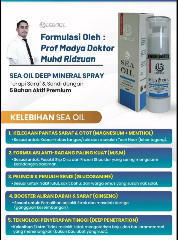 • Ya, SEA OIL diformulasi dari mineral Laut Mati & herba semula jadi seperti camphor, menthol, peppermint, magnesium oil & glucosamine.